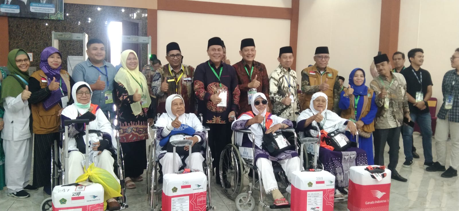 Kloter VI jamaah haji calon Haji asal Langkat dihadiri pejabat dilingkungan Pemerintah Kabupaten Langkat, terlihat Kabang Kesra, Kepala Dinas, para staf ahli dan Kepala Kantor Kementrian Agama Kabupaten Langkat. (Harry)