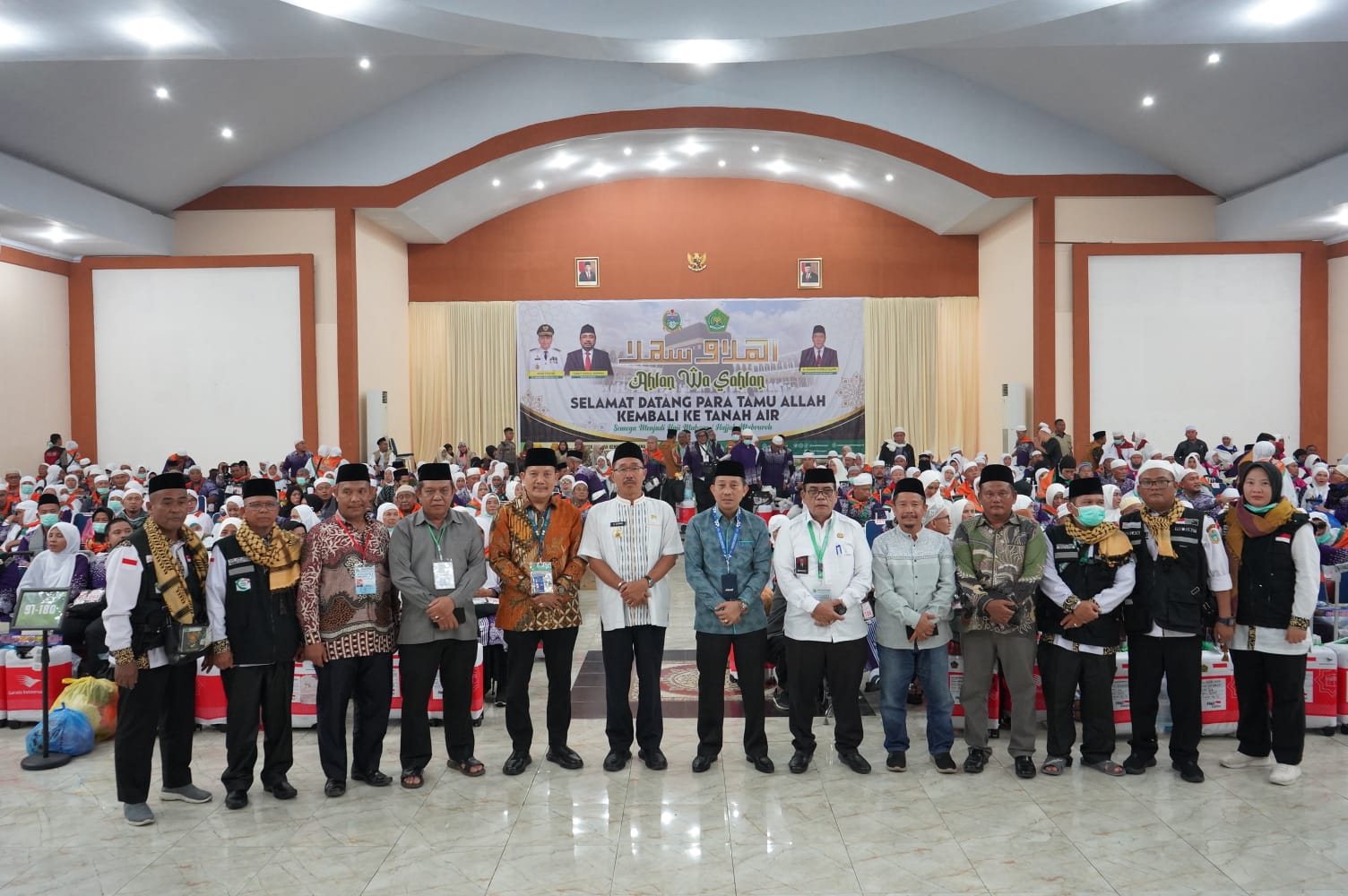 Kepala Bagian Tata Usaha Kanwil Kemenag Sumut H. Muhammad Yunus, MA saat menyambut jemaah haji di Aula 1 Madinatul Hujjaj Asrama Haji Medan mengucapkan Ahlan wa Sahlan Dhuyufurrahman, selamat datang dan selamat kembali ke tanah air semoga meraih predikat haji mabrur.