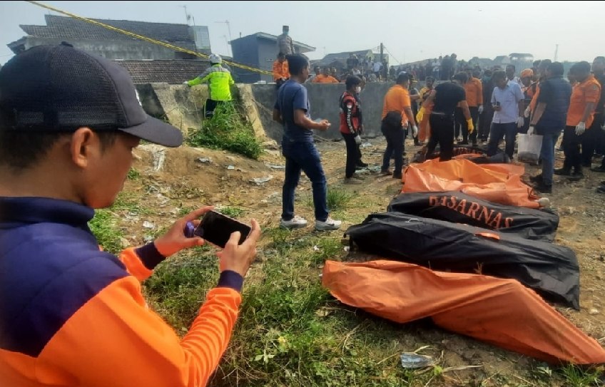 Nampak petugas PMI dan BPBD daerah Kota Bekasi sedang mengangkat kantong Jenazah ke mobil ambulance. Ketujuh jenazah kemudian dibawa ke RS polri Kramat Jati, Jakarta Timur untuk dilakukan otopsi.