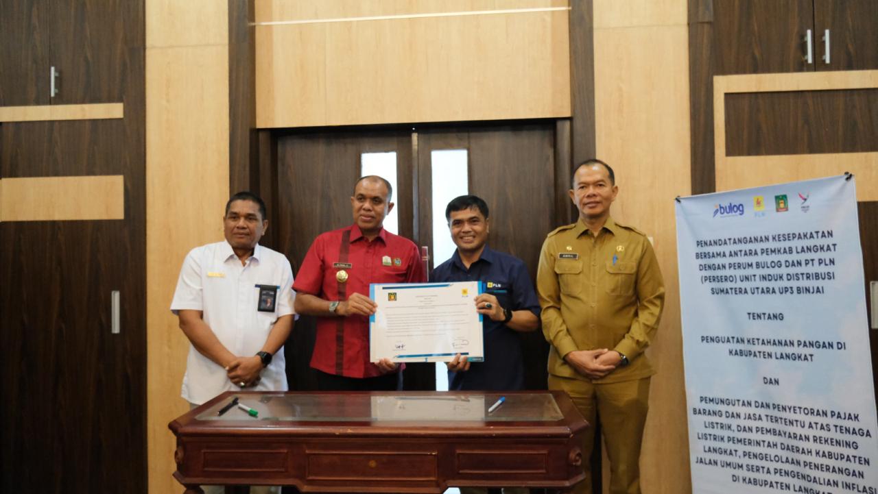 GIMIC.ID, LANGKAT - PLN Unit Pelaksana Pelayanan Pelanggan (UP3) Binjai menandatangani nota kesepahaman (MoU) bersama Pemerintah Kabupaten Langkat dan Perum BULOG. Penandatanganan ini mencakup penguatan ketahanan pangan di Kabupaten Langkat, pemungutan dan penyetoran pajak barang dan jasa tertentu atas tenaga listrik, pengelolaan pembayaran rekening listrik pemerintah daerah, serta pengelolaan penerangan jalan umum.