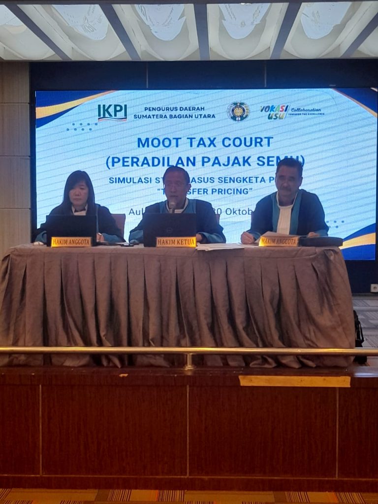 GIMIC.ID, MEDAN - Pelaksanaan simulasi sidang kasus Sengketa Pajak berlangsung Moot Tax Court (Peradilan Pajak Semu) berupa Simulasi Kasus Sengketa Pajak Transfer Pricing. Acara ini adalah kerjasama antara Program Studi Diploma III Administrasi Perpajakan Fakultas Vokasi USU,Tax Centre USU dan Pengda IKPI Sumbagut di Aula Serbaguna FISIP USU, Rabu (30/10/24).