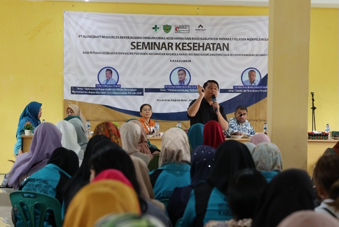 Dokter spesialis anak, dr. Syahreza Hasibuan M.Ked (Ped), Sp.A (kedua dari kanan) memberikan materi, didampingi Senior Manager Community Agincourt Resources Christine Pepah (tengah), di Seminar Kesehatan di Angkola Barat, Tapanuli Selatan, Sumatra Utara, medio 2024. (Dok: PTAR)