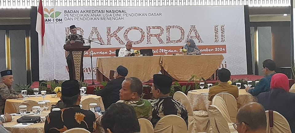 GIMIC.ID, MEDAN - Rakorda II Badan Akreditasi Nasional Pendidikan Anak Usia Dini, Pendidikan Dasar, Pendidikan Menengah (BAN PDM) Provinsi Sumatera Utara digelar pada Senin, 2 Desember 2024 di Hotel Emerald Garden Jalan K. L Yos Sudarso No. 1 Medan. Ketua BAN PDM Sumut Prof. Dr. Khairil Ansari, MPd. mengatakan pada Tahun 2024 BAN PDM Provinsi Sumatera Utara telah mengakreditasi 3.056 satuan pendidikan yang terdiri dari 1.566 tingkat PAUD dan 1.990 tingkat Dasmen.