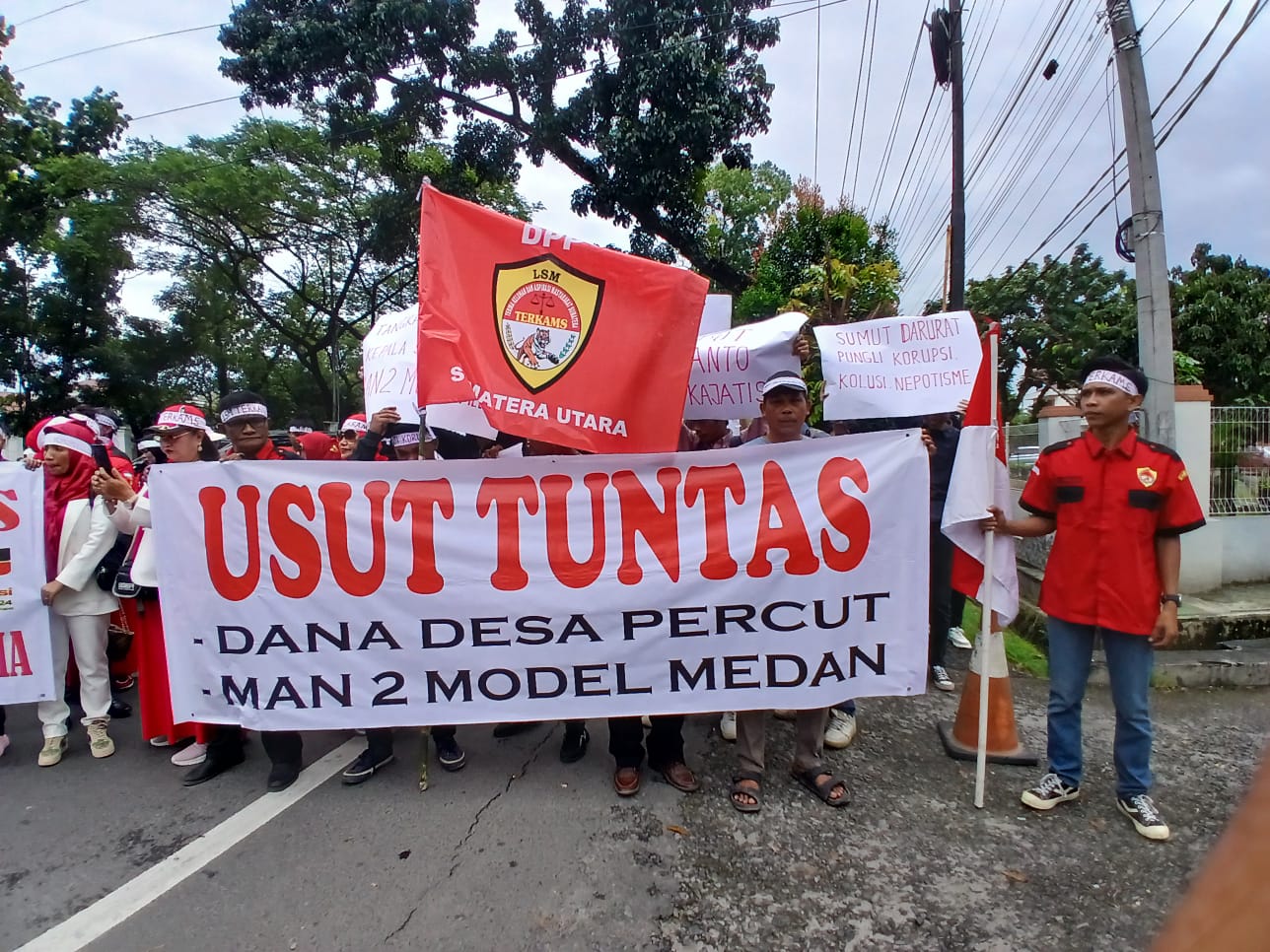 Dalam orasinya massa LSM TERKAMS membawa kertas karton yang berisikan tuntutan dan membentangkan spanduk yang bertuliskan usut tuntas Dana Desa Percut, MAN 2 Model Medan, Tangkap Kepada Desa Percut.