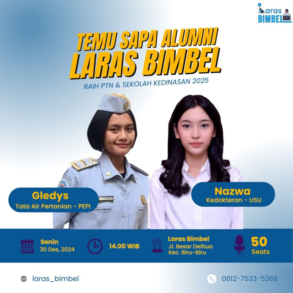 Dua alumni utama yang menjadi sorotan dalam acara ini adalah Nazwa Latifah, mahasiswi Fakultas Kedokteran Universitas Sumatera Utara (USU), dan Gledys Oktavia Selabina Br Ginting, mahasiswi Program Studi Tata Air Pertanian di Politeknik Enjiniring Pertanian Indonesia (PEPI). Keduanya berbagi pengalaman dan inspirasi untuk memotivasi peserta Laras Bimbel.