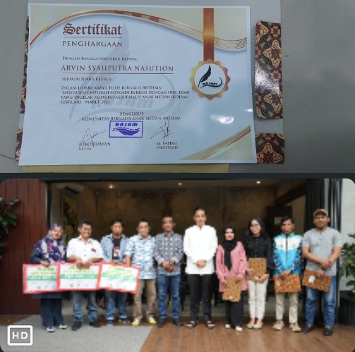 GIMIC.ID, MEDAN - Wartawan ArmadaBerita.com, Arvin Syahputra Nasution, berhasil meraih juara ketiga dalam lomba karya tulis jurnalistik bertema “Mengubah Musibah Menjadi Berkah dengan UHC-JKMB” yang digelar oleh Komunitas Jurnalis Anak Medan (KOJAM).