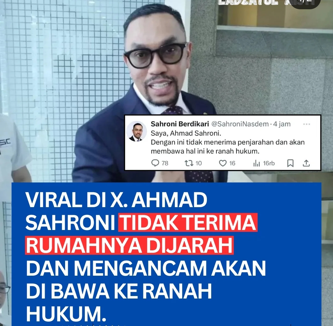 Dalam unggahan yang beredar, rumah milik politisi NasDem itu disebut menjadi sasaran amarah warga hingga mengalami kerusakan. Namun, Ahmad Sahroni membantah tudingan tersebut dan menyatakan tidak terima namanya dikaitkan dengan kerusuhan. Ia menegaskan akan membawa kasus ini ke ranah hukum untuk mencari keadilan.
