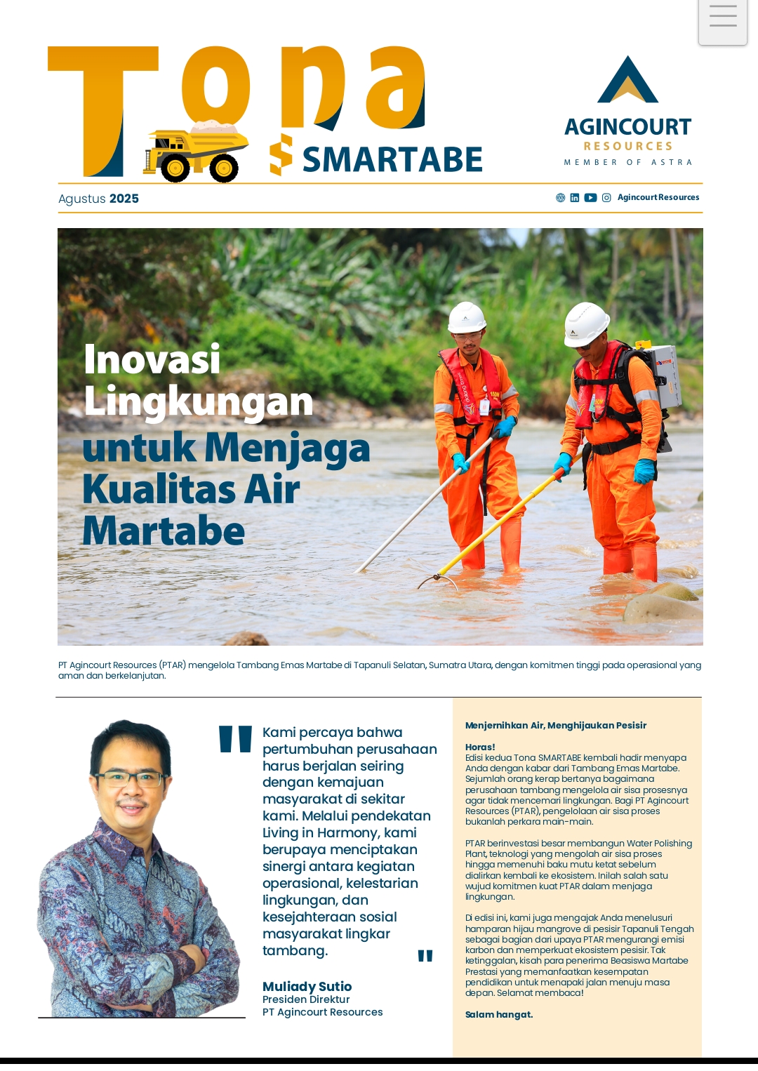 GIMIC.ID, MEDAN – Edisi kedua Tona Smartabe kembali hadir dengan sajian cerita inspiratif yang menarik untuk dibaca. Dalam edisi terbaru ini, pembaca diajak menyelami beragam inovasi dan prestasi yang terjadi di sekitar Tambang Emas Martabe.