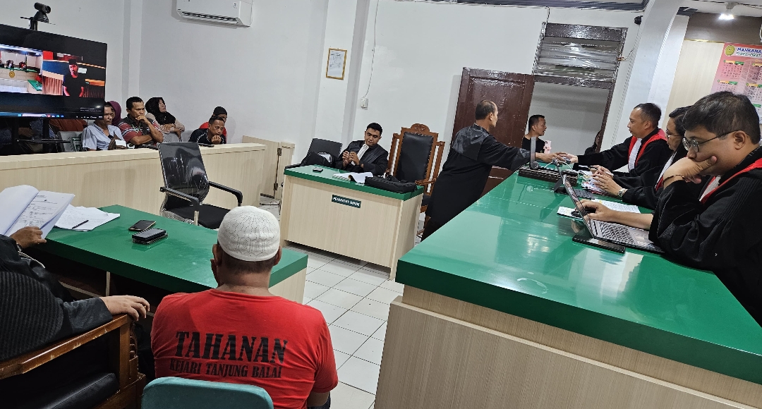 Suasana sidang kasus narkotika dengan terdakwa Rahmadi di Pengadilan Negeri Tanjungbalai, Senin (16/9/2025), menghadirkan saksi meringankan secara daring.