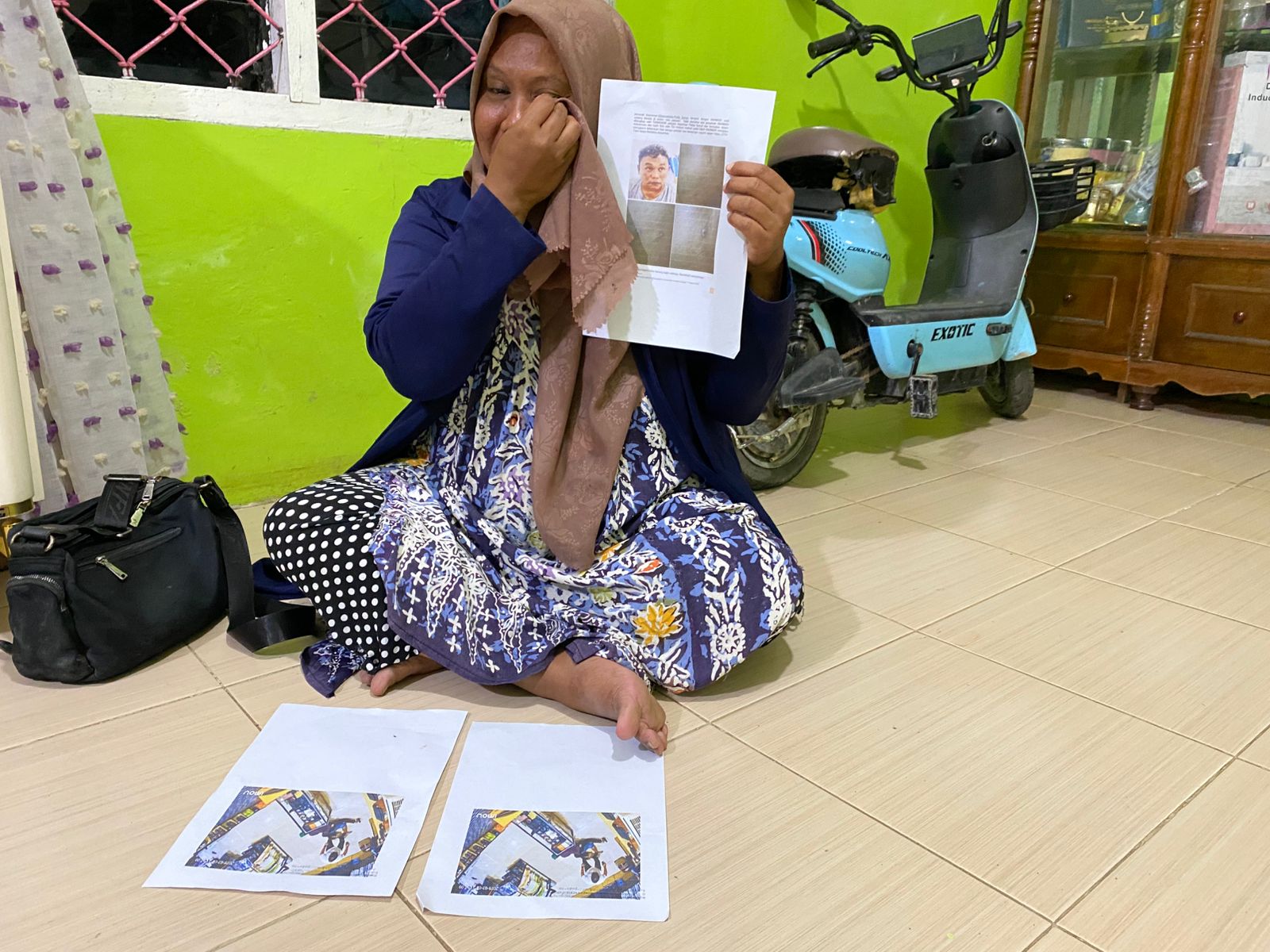 Seorang anggota keluarga Rahmadi menangis sambil menunjukkan foto dan bukti dugaan rekayasa kasus narkoba di rumah mereka di Tanjungbalai, Minggu (21/9/2025).
