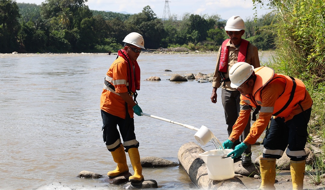 Petugas Agincourt Resources bersama Tim Terpadu melakukan pengambilan sampel air di Sungai Batang Toru untuk pemantauan kualitas air secara rutin.