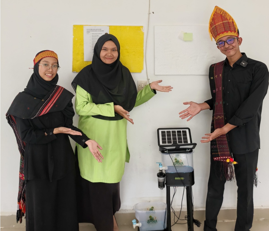 Guru pembimbing bersama Tim Riset MAN Insan Cendekia Tapanuli Selatan memperlihatkan inovasi “Kios Air dengan Implementasi Bio-Based Filtration dan Integrasi Pot Pengisi Daya Surya Skala Mikro” yang mengantarkan mereka meraih Juara 2 Nasional Sobat Competition 2025.