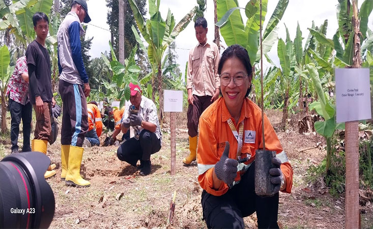 Senior Manager Community PT Agincourt Resources, Christine Pepah, bersama masyarakat petani menanam bibit kakao dalam program Martabe Cocoa di Desa Huta Godang, Kecamatan Batang Toru, Kabupaten Tapanuli Selatan, Kamis (16/10/2025).