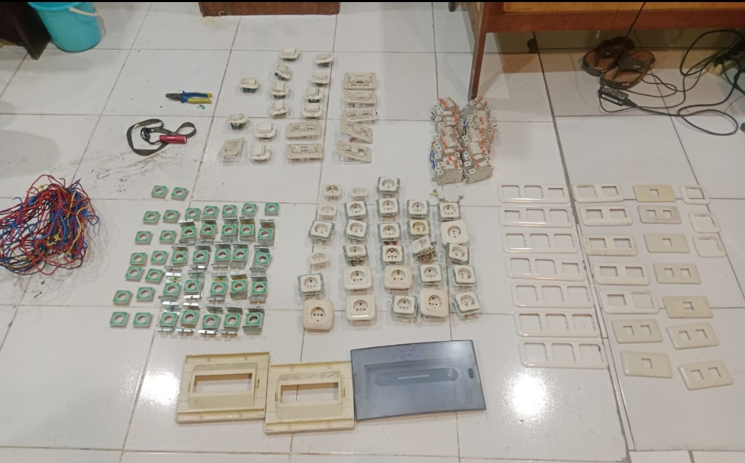 Barang bukti hasil kejahatan yang diamankan Polsek Medan Tuntungan berupa puluhan instalasi listrik, saklar, kabel, dan perlengkapan instalasi lainnya yang dicuri dari bekas Rumah Sakit Ananda Putri, Medan.