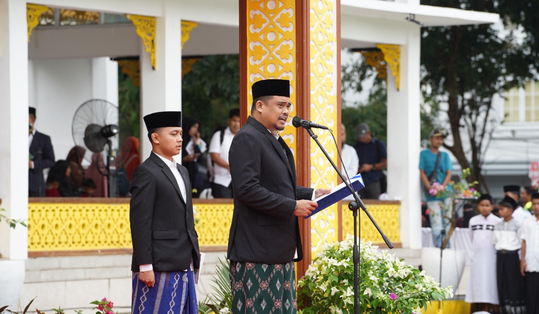 Gubernur Sumatera Utara Muhammad Bobby Afif Nasution memimpin Apel Akbar Hari Santri 2025 di Lapangan Merdeka Binjai bersama ribuan santri dan jajaran Kementerian Agama Sumut.