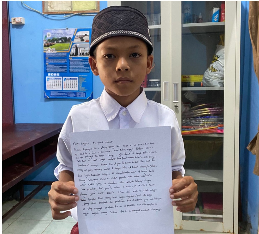 Kegiatan itu sudah menjadi rutinitas Al sejak duduk di kelas I MIN 2 Batu Bara. Kini, di usia sekolah dasar kelas VI, semangatnya untuk membantu keluarga tak pernah padam, meski kelelahan kerap menghampiri.
