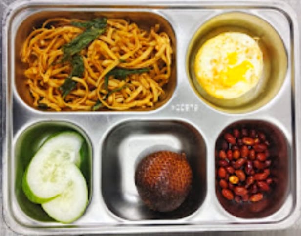 Hidangan bergizi Dapur SPPG ASPIRA di Desa Benua Raja, Kecamatan Rantau, Aceh Tamiang — terdiri dari mie sayur, telur ceplok, kacang goreng, irisan timun, dan buah salak, dirancang untuk mendukung kebutuhan gizi harian pelajar.