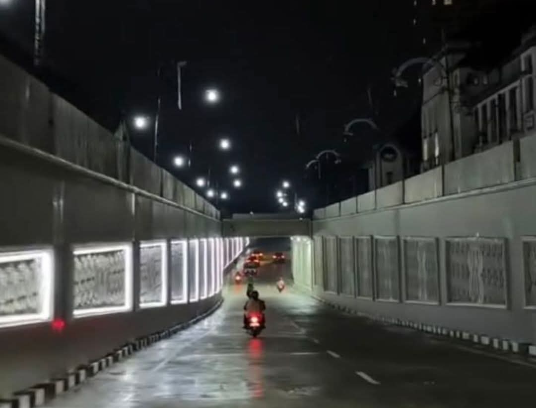 Kondisi underpass HM Yamin, Medan, yang gelap akibat pencurian kabel dan panel LPJU. Dishub Medan segera lakukan perbaikan dan laporkan ke polisi.