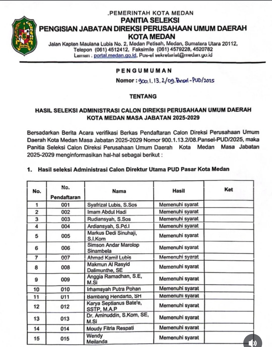 Berikut daftar 15 peserta yang lolos administrasi calon Direktur Utama PUD Pasar Medan: