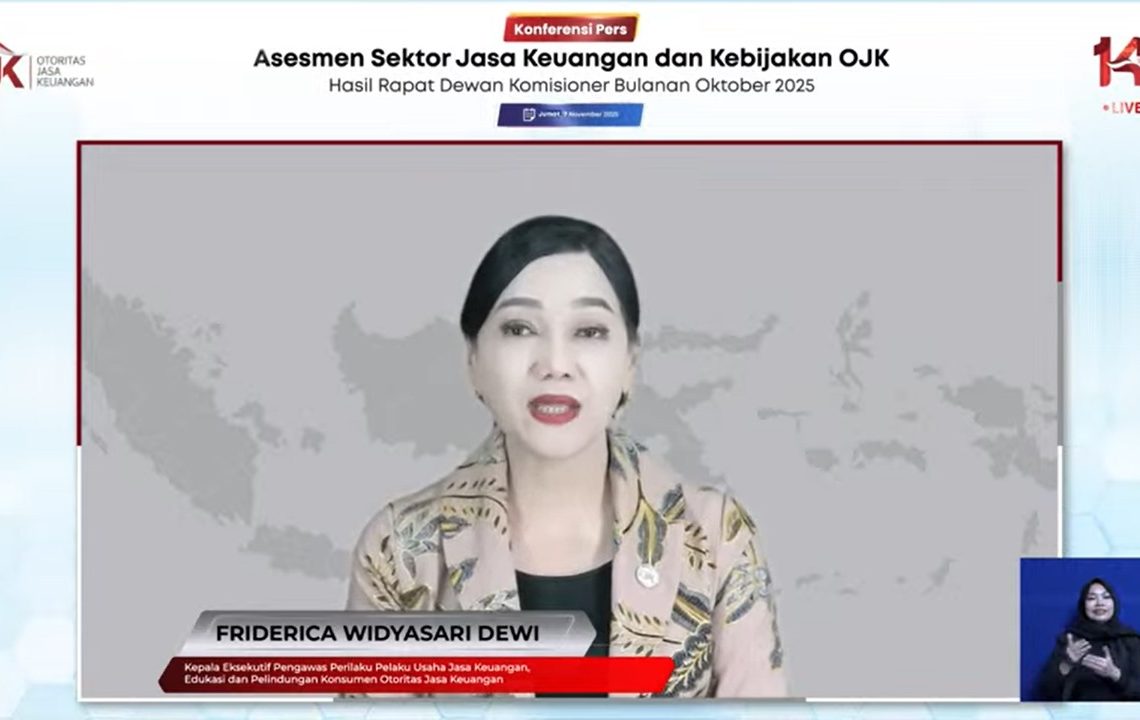 Kepala Eksekutif Pengawas Perilaku Pelaku Usaha Jasa Keuangan, Edukasi, dan Pelindungan Konsumen OJK, Friderica Widyasari Dewi, saat menyampaikan paparan dalam konferensi pers hasil Rapat Dewan Komisioner (RDK) OJK secara virtual, Jumat (7/11/2025).