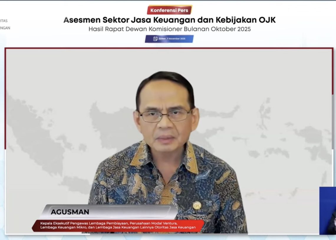 Kepala Eksekutif Pengawas PVML OJK, Agusman, memaparkan kinerja industri pinjaman daring dan langkah pengawasan terhadap penyelenggara fintech lending dalam konferensi pers hasil RDK OJK, Jumat (7/11/2025).