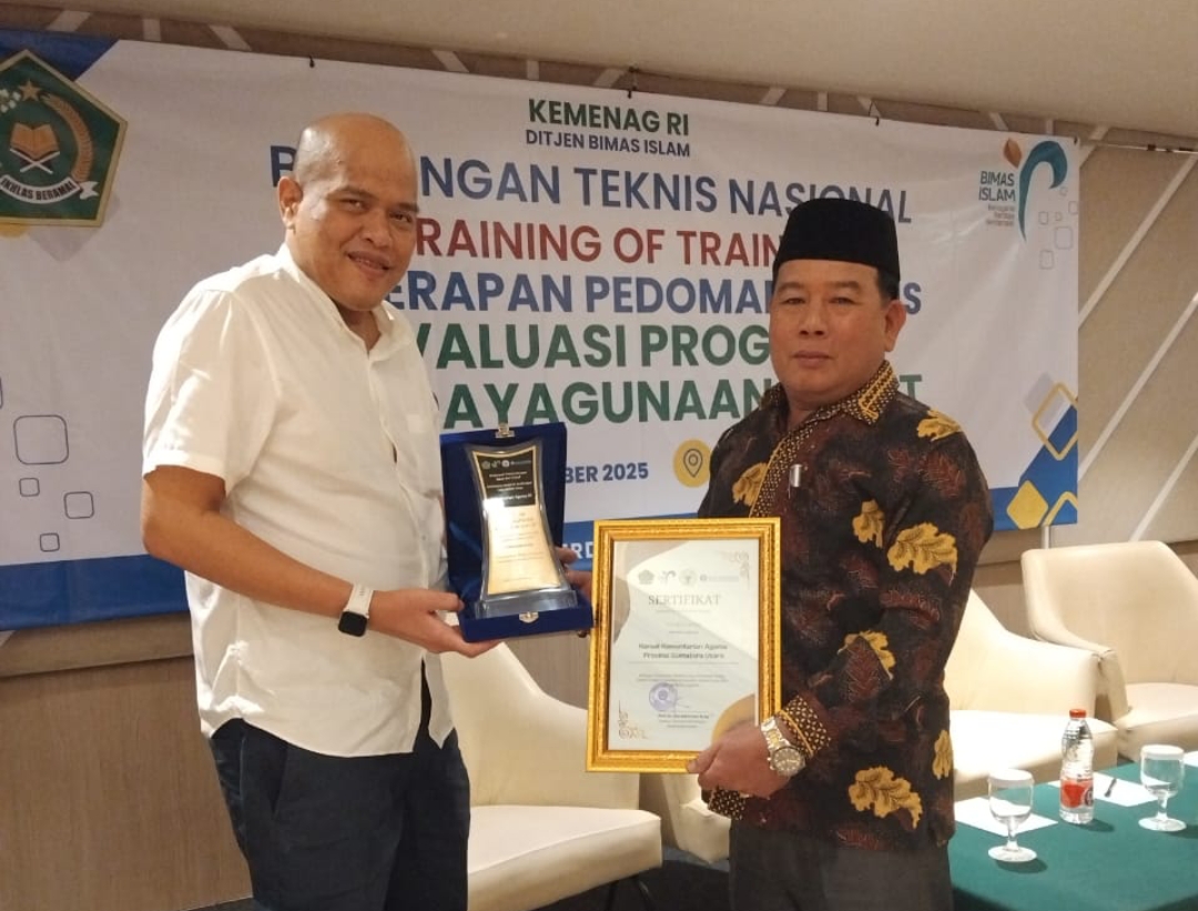 Ketua Tim Zakat dan Wakaf Kanwil Kemenag Sumut, Sari Putra, S.Ag, M.Kom.I, menerima penghargaan Pengumpul Wakaf Uang Terbanyak Ketiga se-Indonesia dari Kasubdit Perizinan Lembaga Zakat dan Wakaf, H. Abd. Fatah, MM, pada acara ToT Bimtek Nasional di Jakarta, Selasa (12/11/2025).