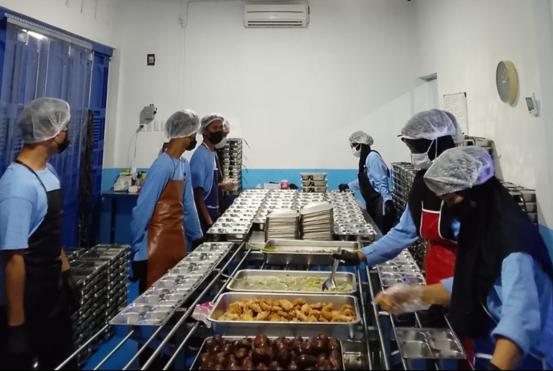 Ada yang menakar lauk ke dalam wadah stainless steel, sementara yang lain memastikan suhu makanan tetap terjaga dan setiap kotak tertutup rapat. Di sudut lain, petugas dengan teliti mencatat daftar pengiriman agar tidak ada porsi yang terlewat.