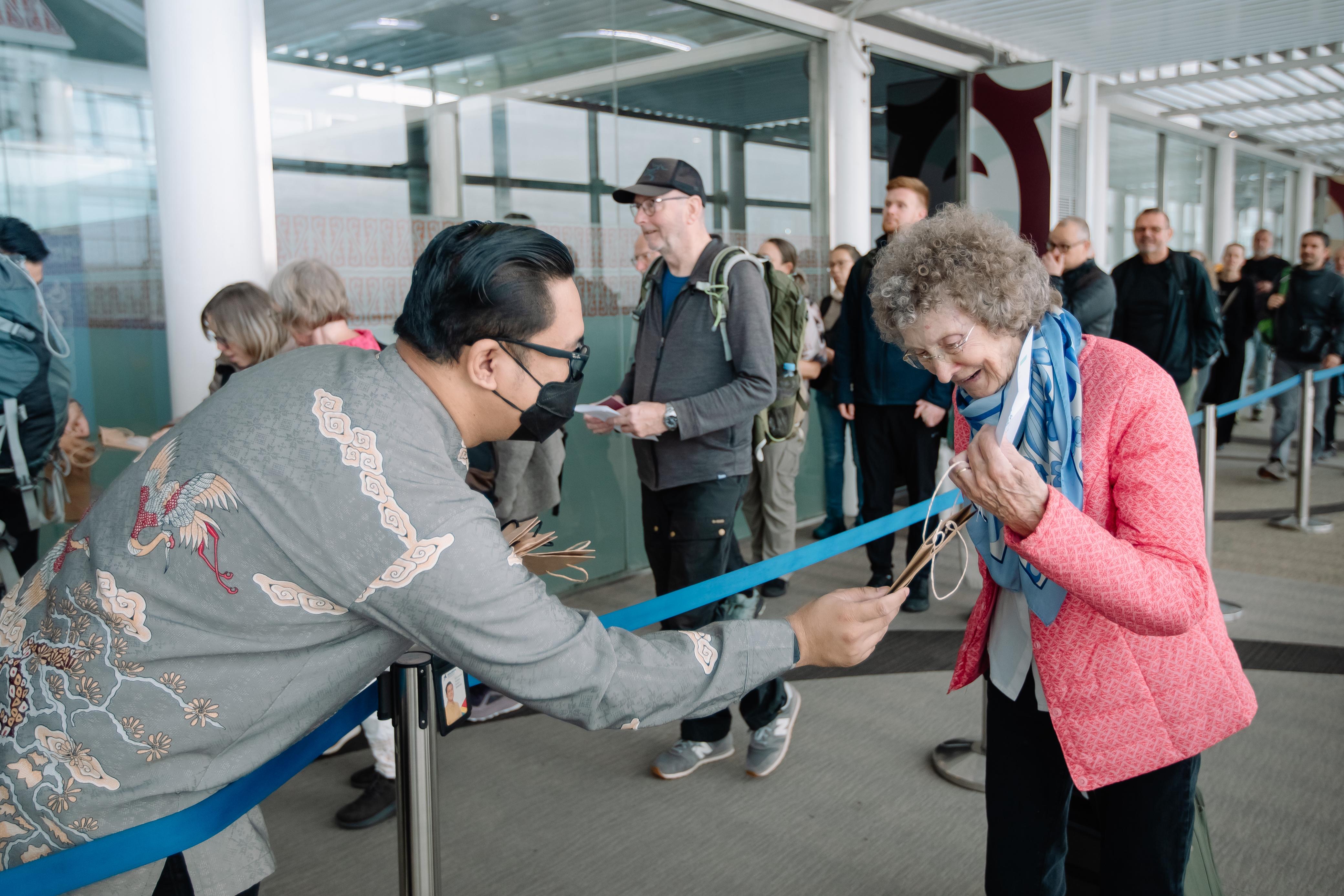 Petugas Bandara Internasional Kualanamu menyambut hangat kedatangan penumpang internasional dengan membagikan suvenir khas lokal sebagai bentuk pelayanan dan apresiasi kepada wisatawan.