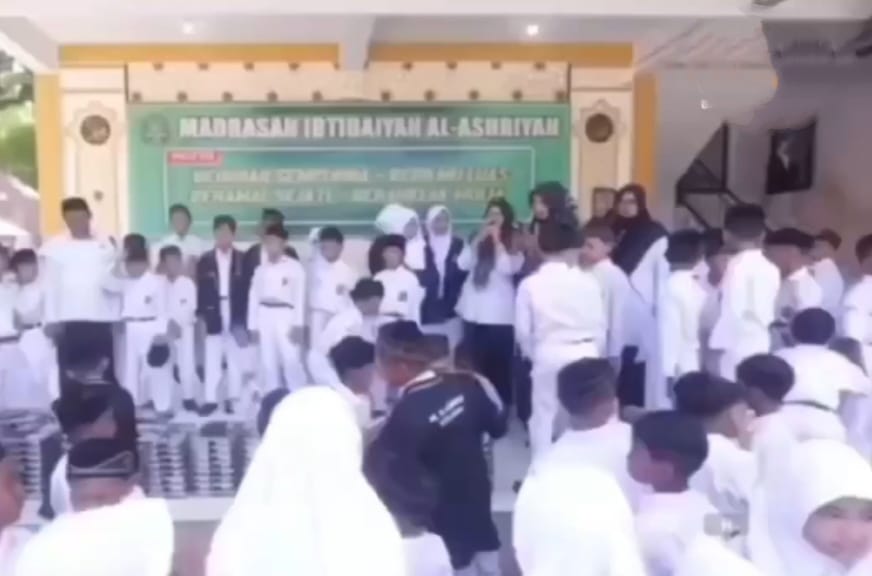 Suasana murid dan guru Madrasah Ibtidaiyah Al-Ashriyyah saat menerima dan membagikan paket makan bergizi, diiringi antusiasme para siswa yang memenuhi halaman sekolah.