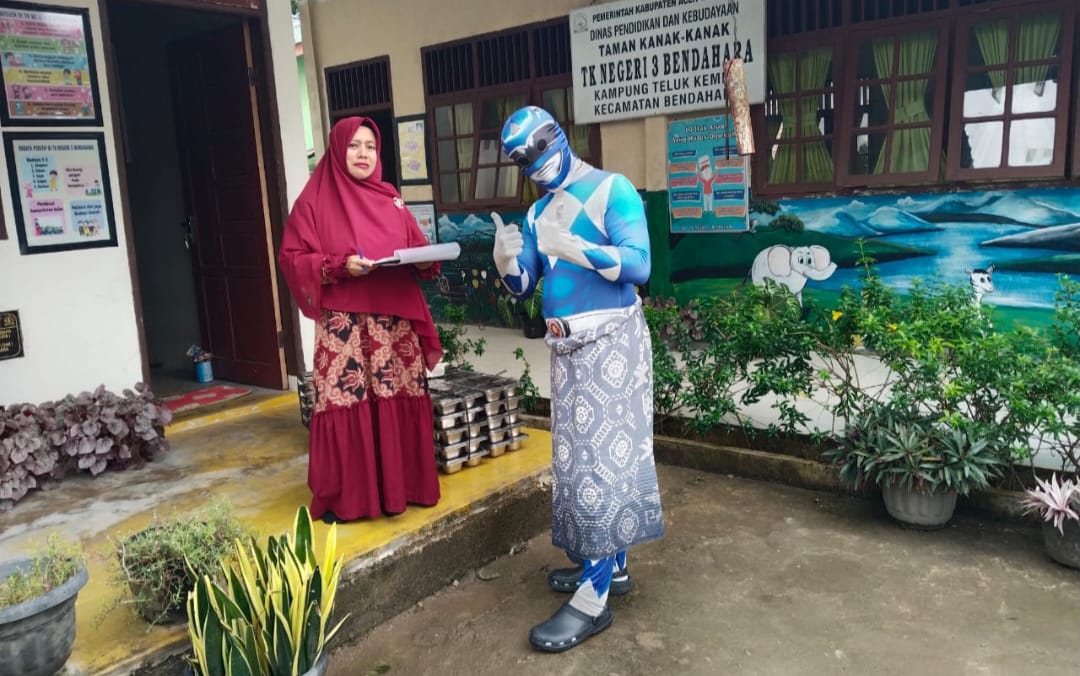 Seorang petugas mengenakan kostum tokoh pahlawan berwarna biru saat mengantar dan menyerahkan makanan bergizi gratis di TK Negeri 3 Bendahara, Aceh Tamiang, disambut oleh guru setempat.