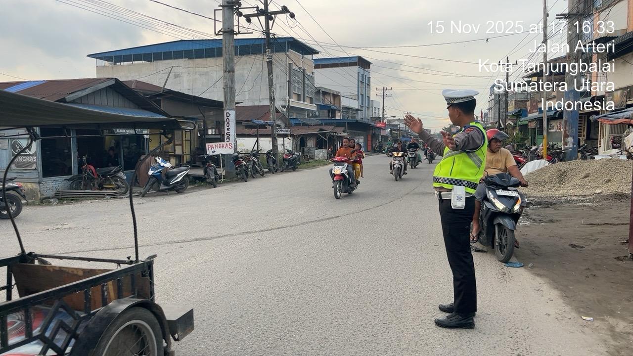 Personel Sat Lantas Polres Tanjung Balai melakukan pengaturan arus lalu lintas saat pelaksanaan Patroli Sore di Jalan Arteri, Kota Tanjung Balai, untuk menjaga kelancaran dan keamanan pengguna jalan.