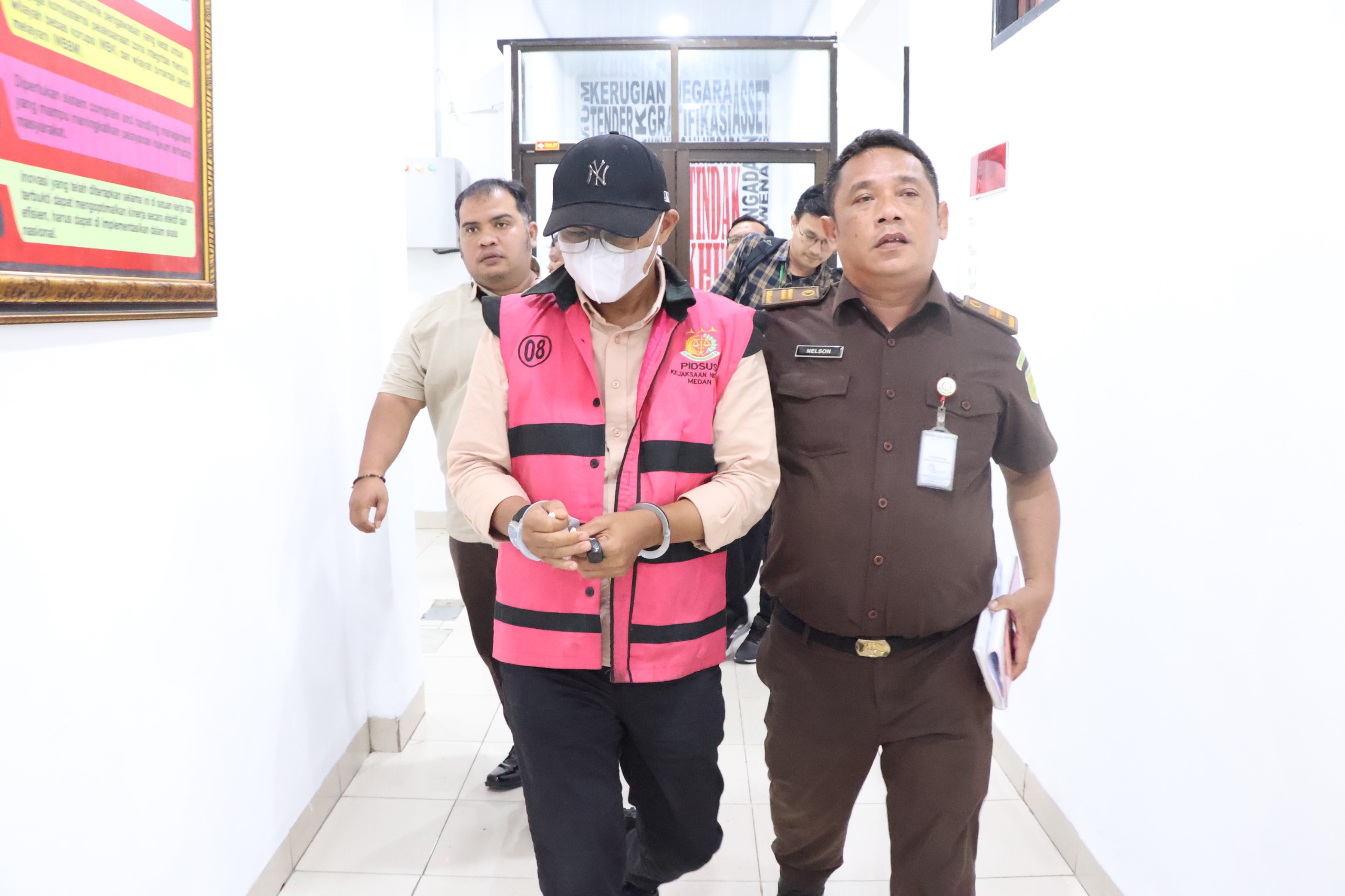 Petugas Kejaksaan Negeri Medan menggiring seorang tersangka yang mengenakan rompi tahanan berwarna merah muda menuju ruang tahanan setelah ditetapkan dalam kasus dugaan korupsi.
