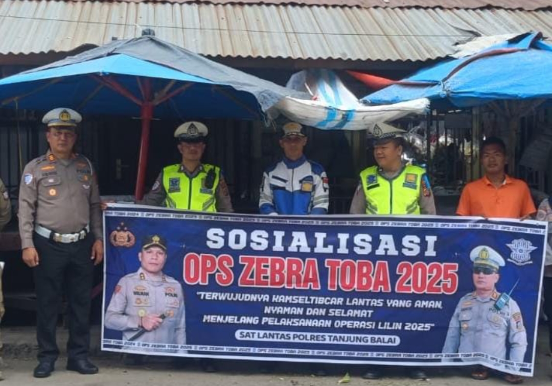 Personel Sat Lantas Polres Tanjung Balai melakukan sosialisasi Operasi Zebra Toba 2025 kepada masyarakat sebagai upaya meningkatkan kesadaran tertib berlalu lintas.