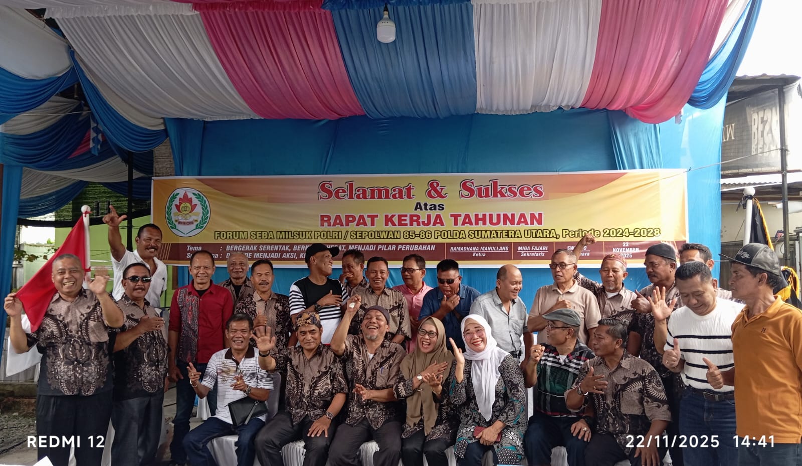 GIMIC.ID, MEDAN – Alumni Sekolah Bintara Polri Tahun Ajaran 1985–1986 Polda Sumatera Utara yang tergabung dalam Forum SEBA MILSUK Polri (FORSEBA) bersama Sekolah Polisi Wanita (SEPOLWAN) menggelar Rapat Kerja Tahunan, Sabtu (22/11/2025), di Sekretariat FORSEBA 85/86, Jalan A. Sani Mutalib Lingkungan XII, Kelurahan Terjun, Kecamatan Medan Marelan.