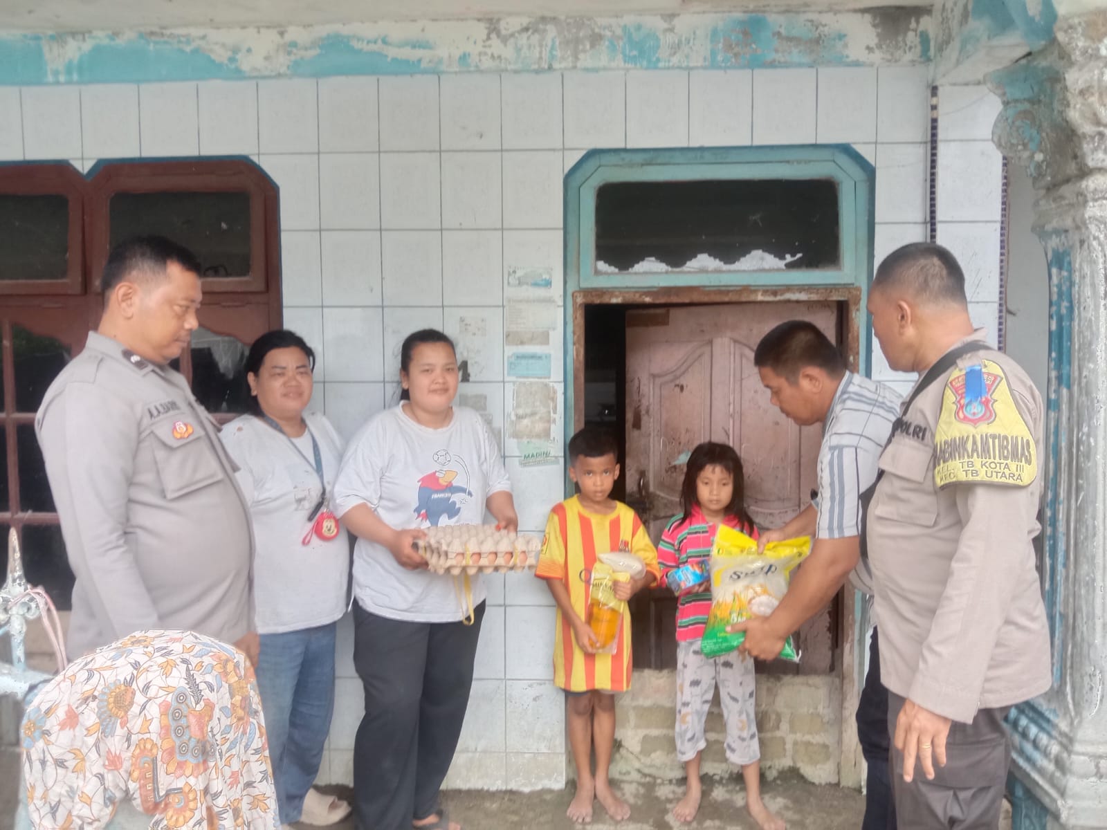 Personel Polsek Tanjung Balai Utara menyerahkan bantuan sosial kepada warga dalam kegiatan Minggu Kasih sebagai bentuk kepedulian dan penguatan hubungan polisi dengan masyarakat.