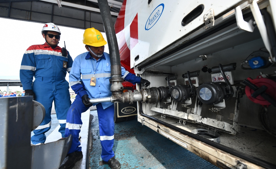 Petugas melakukan proses pengisian dan pengecekan distribusi BBM pada mobil tangki di area depo, dengan menerapkan standar keselamatan kerja untuk memastikan kelancaran dan keamanan suplai bahan bakar.