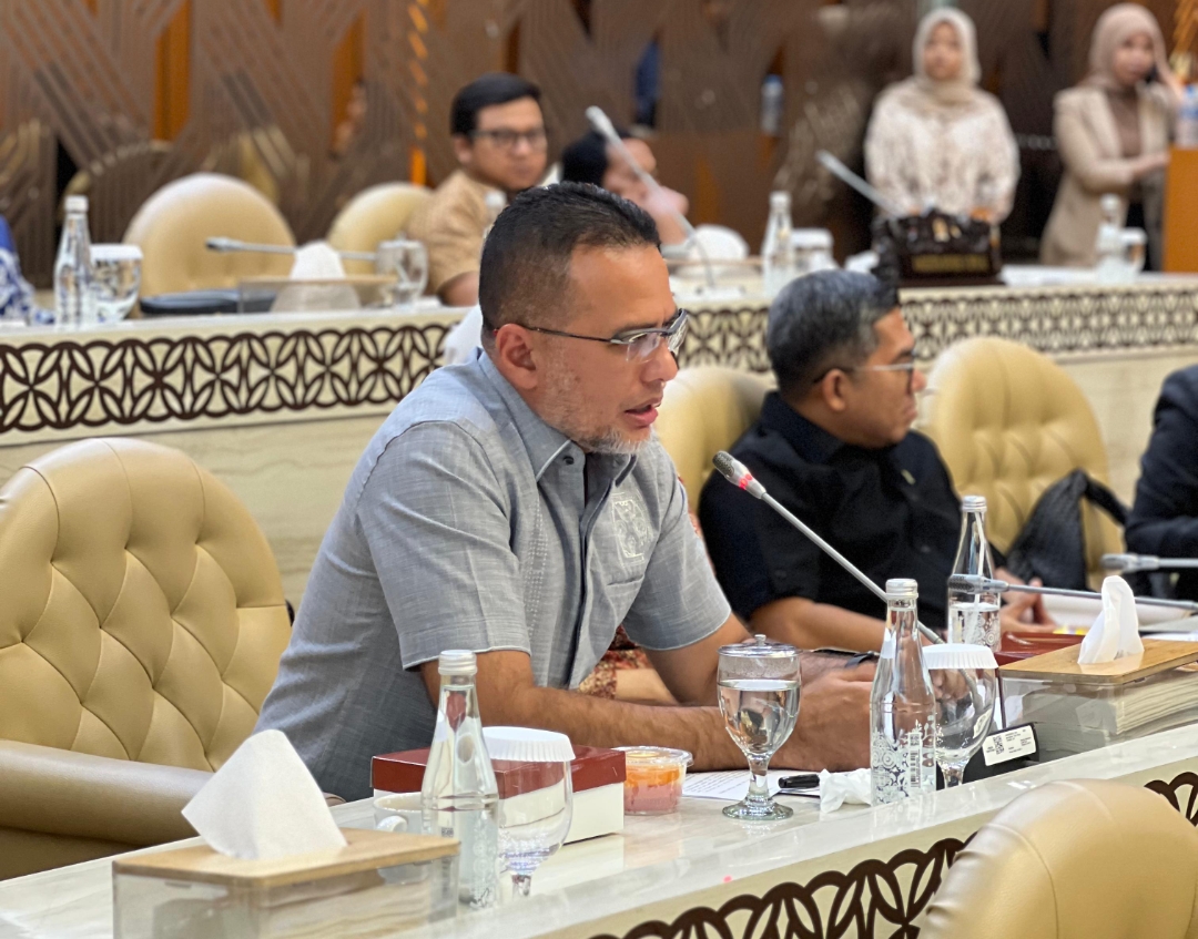 Musa Rajekshah, menyampaikan paparan dalam rapat kerja bersama jajaran peserta di ruang sidang, membahas agenda strategis terkait kebijakan dan program pembangunan daerah.