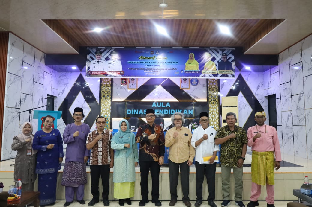 Wakil Wali Kota Tanjungbalai bersama jajaran Dinas Pendidikan, perwakilan Kesultanan Asahan, narasumber, dan peserta Workshop Budaya berfoto bersama usai pembukaan kegiatan bertema “Sejarah Perjuangan Sultan Ahmadsyah Melawan Kolonial Belanda di Asahan” di Aula Dinas Pendidikan Kota Tanjungbalai, Kamis (27/11/2025)