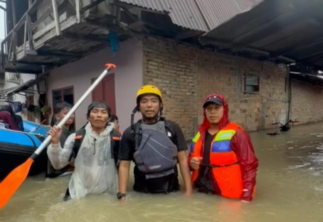Relawan menyusuri genangan banjir untuk mengevakuasi warga terdampak di salah satu permukiman yang terendam tinggi di Sumatera. Mereka bekerja di tengah hujan dan arus kuat demi memastikan keselamatan masyarakat.