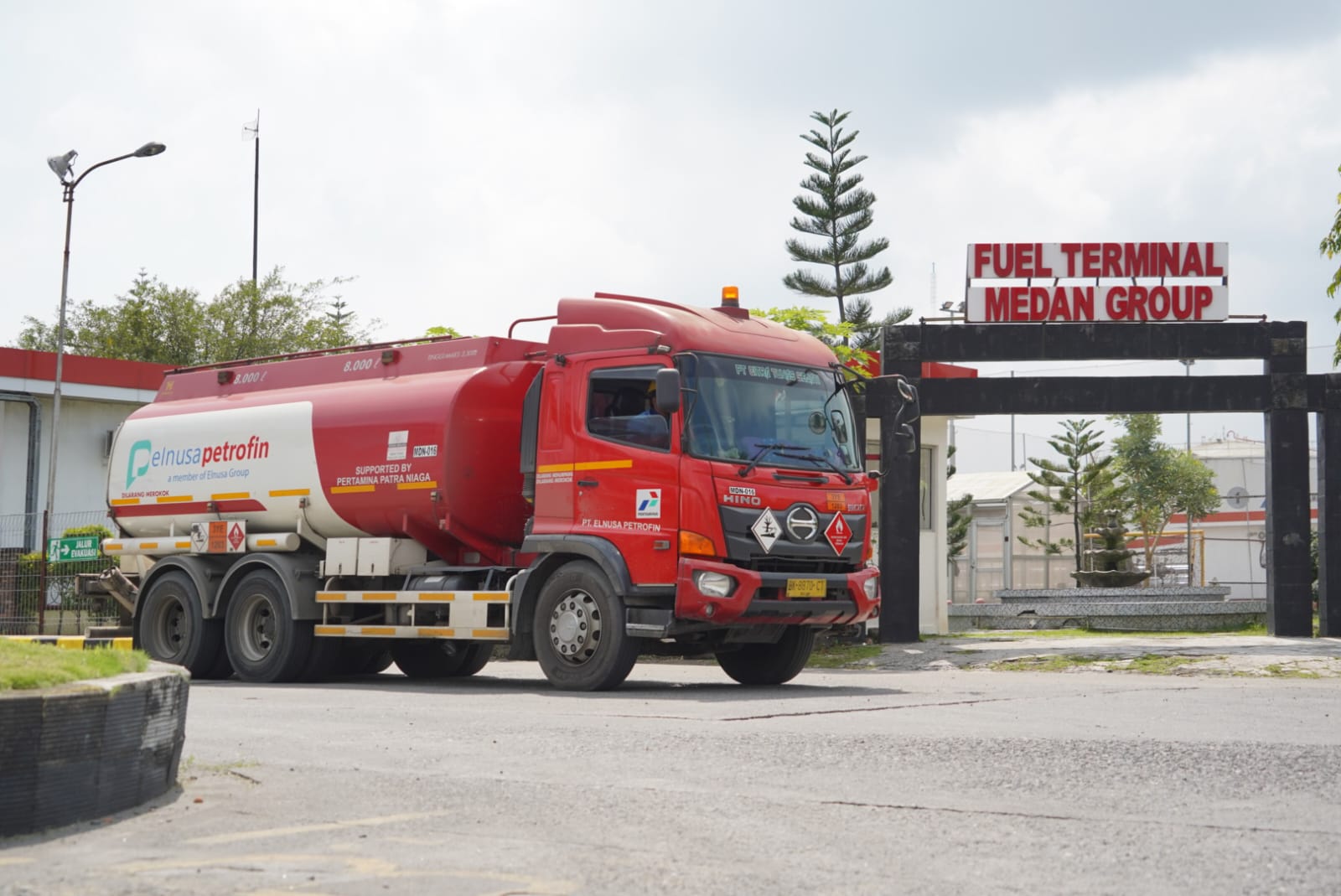 Mobil tangki pengangkut BBM bergerak keluar dari Fuel Terminal Medan Group sebagai bagian dari upaya Pertamina Patra Niaga Sumbagut menjaga kelancaran distribusi energi di tengah masa tanggap darurat.
