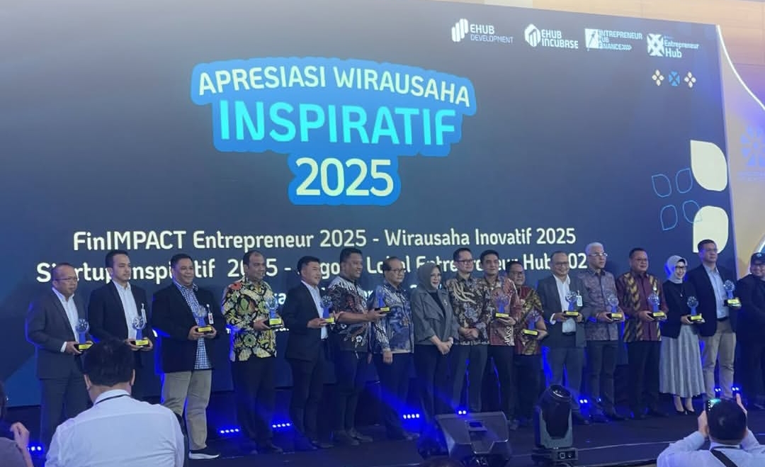 Para penerima Penghargaan Wirausaha Inspiratif 2025 berfoto bersama di panggung utama usai penyerahan apresiasi oleh Kementerian UMKM RI pada acara Apresiasi Wirausaha Inspiratif 2025 di JS Luwansa Hotel Convention Center, Jakarta.