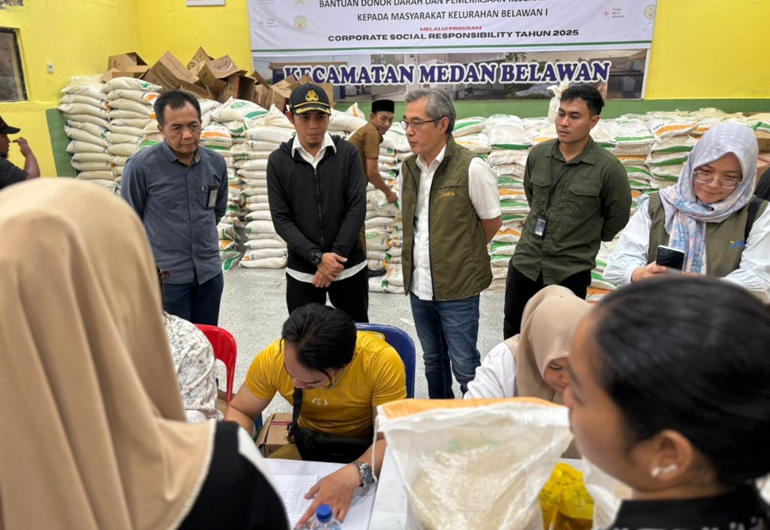 Direktur Keuangan Perum Bulog Hendra Susanto meninjau proses penyaluran bantuan pangan kepada warga di Kecamatan Medan Belawan. Sejumlah petugas terlihat melakukan pendataan penerima bantuan di lokasi.