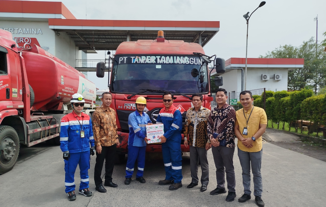 Petugas Pertamina Patra Niaga Regional Sumbagut menyerahkan paket bantuan kepada pengemudi mobil tangki di Fuel Terminal Medan sebagai bentuk apresiasi dan dukungan terhadap kelancaran distribusi BBM di wilayah Sumatera Utara.