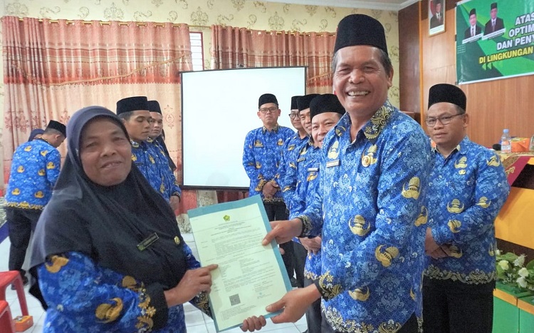Seorang pegawai menerima surat keputusan pengangkatan dalam acara penyerahan SK PPPK di lingkungan Kementerian Agama Kabupaten Dairi. Prosesi berlangsung hangat dan penuh haru, disaksikan para pejabat dan ASN yang hadir.