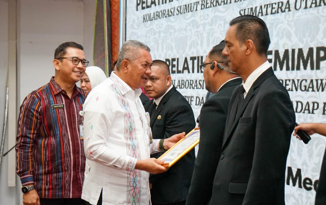 Suasana penutupan Pelatihan Kepemimpinan Administrator (PKA) dan Pelatihan Kepemimpinan Pengawas (PKP) Tahun 2025 di BPSDM Sumut. Seorang pejabat tampak menyerahkan sertifikat kepada peserta sebagai bentuk apresiasi atas penyelesaian proyek perubahan dan komitmen peningkatan kompetensi ASN.