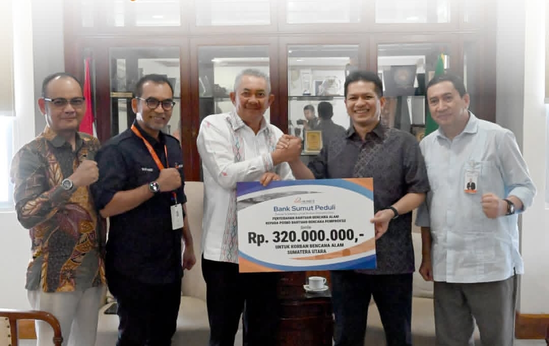 “Manajemen PT Bank Sumut menyerahkan bantuan Rp320 juta melalui program Bank Sumut Peduli kepada Pemerintah Provinsi Sumatera Utara untuk mendukung penanganan korban banjir bandang dan longsor.”