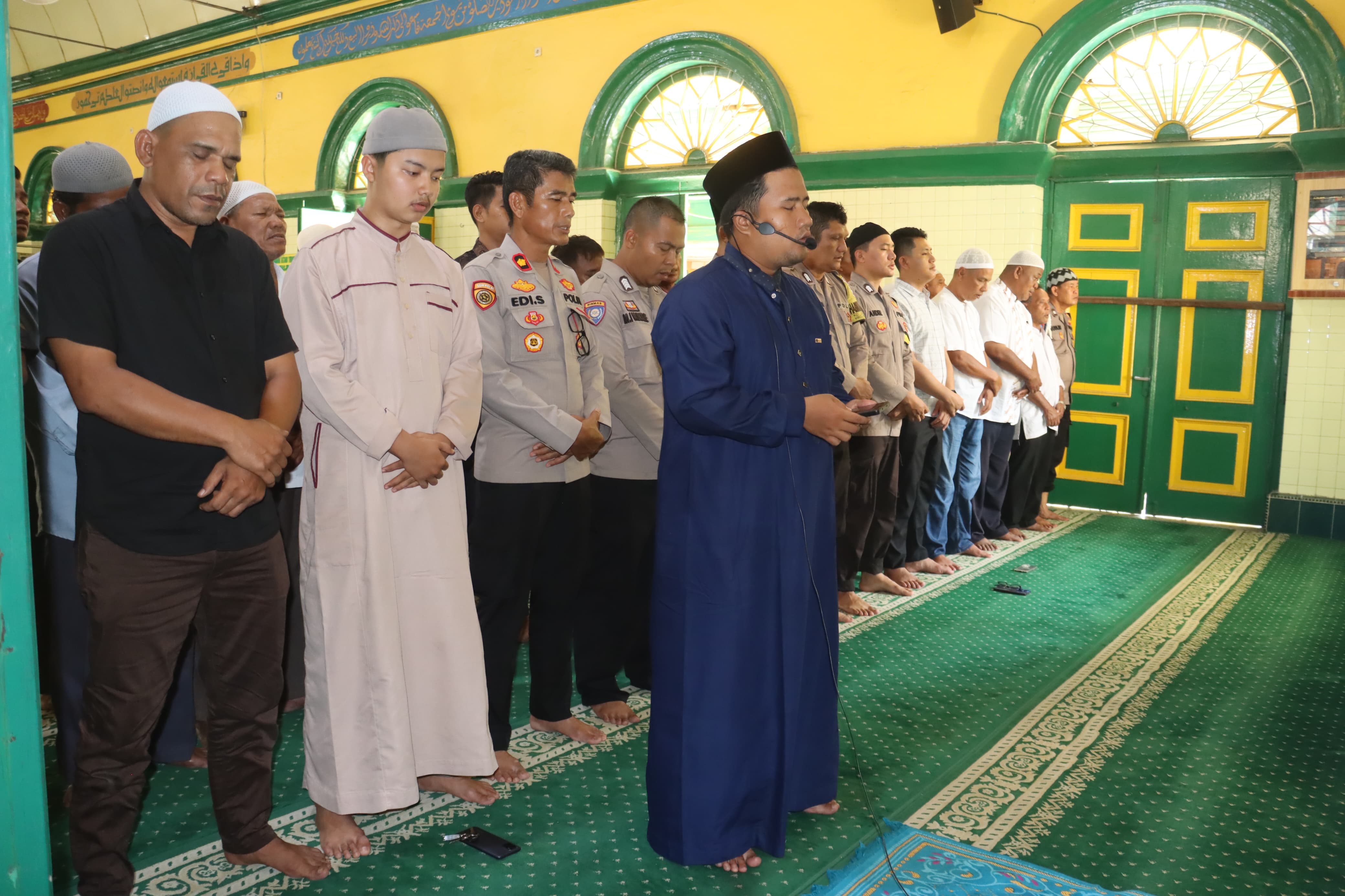 "Sejumlah personel kepolisian dan masyarakat melaksanakan salat berjemaah dipimpin seorang imam di dalam masjid sebagai wujud kebersamaan dan penguatan spiritual."