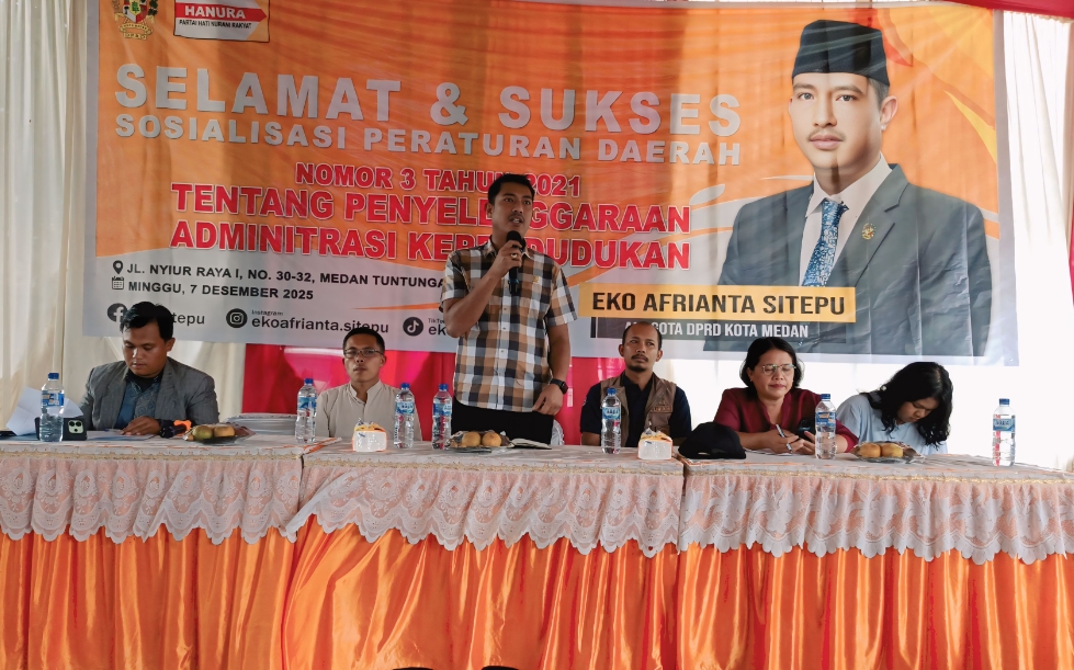 GIMIC.ID, MEDAN — Anggota DPRD Kota Medan, Eko Afrianta Sitepu, melaksanakan kegiatan Sosialisasi Peraturan Daerah (Perda) Kota Medan Nomor 3 Tahun 2021 tentang Penyelenggaraan Administrasi Kependudukan di Jalan Nyiur 1, Kelurahan Mangga, Kecamatan Medan Tuntungan, Minggu (7/12/25).