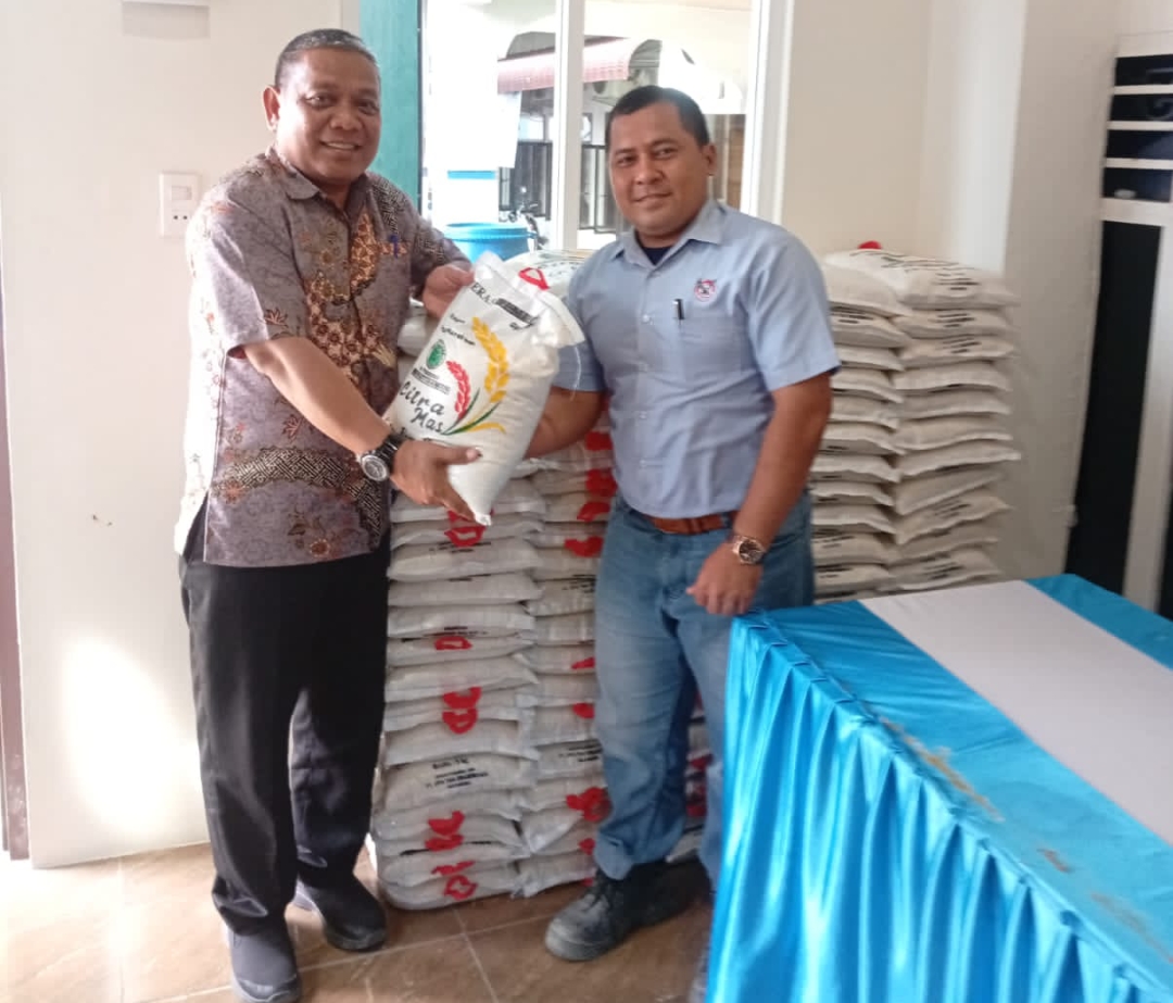 Perwakilan PT Jui Shin Indonesia, Richo Cristian Hasoloan Nababan, menyerahkan bantuan beras kepada Kepala Desa Saentis, Asmawito, S.Sos, untuk warga terdampak banjir di Percut Sei Tuan.