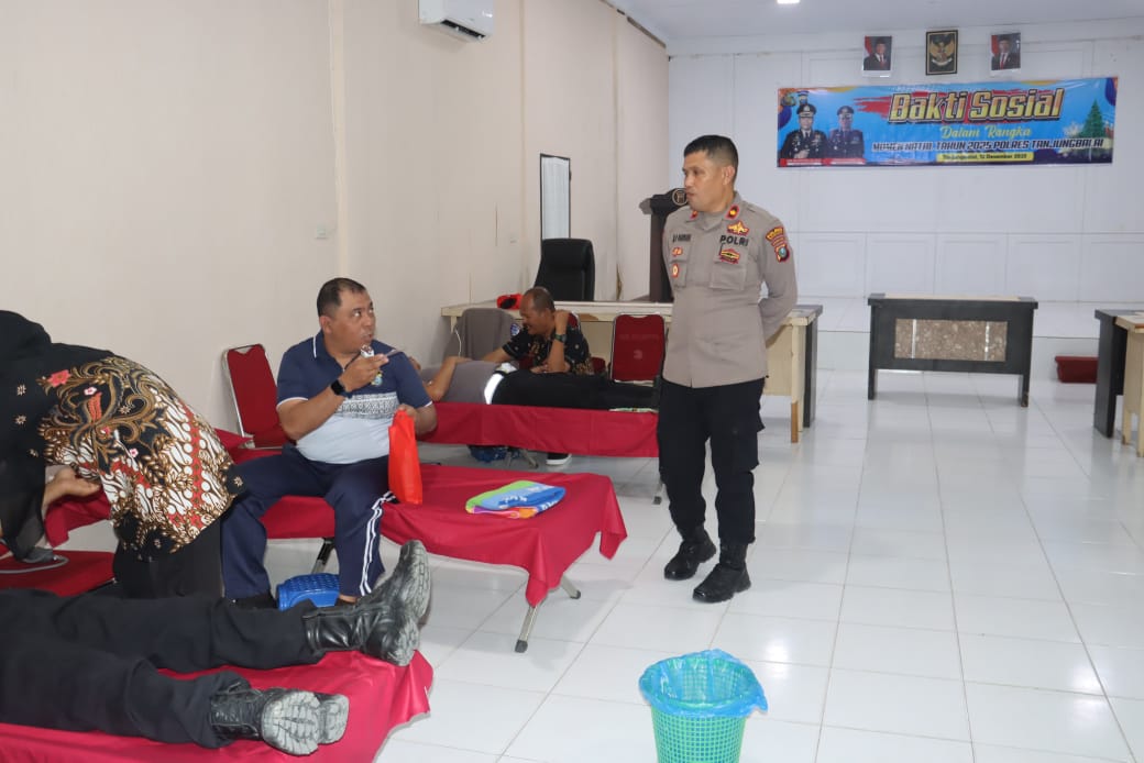 Wakil Kapolres Tanjungbalai meninjau pelaksanaan donor darah yang diikuti personel Polres Tanjungbalai dalam rangka bakti sosial menyambut Natal 2025 di Aula Sarja Arya Racana.